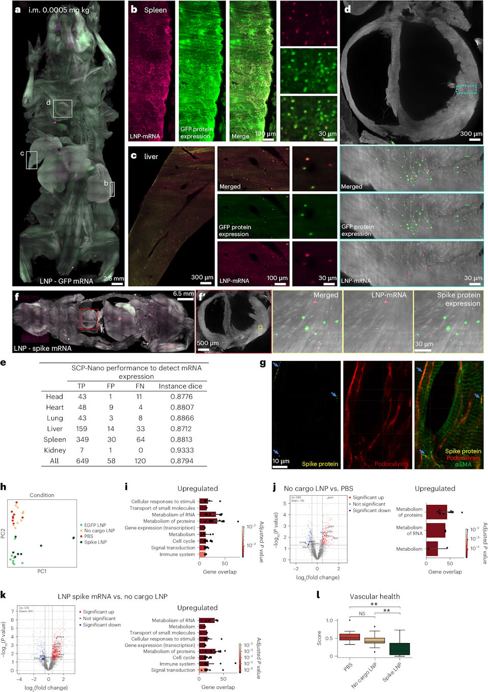 4. ábra: Lipid nanorészecskékkel bejuttatott mRNS-ből származó fehérje expressziója. Teljes test (a), lép (b), máj (c) és szív (d). f: az izomba beadott, lipid nanorészecskékkel bejuttatott mRNS-ből származó SARS-CoV-2 S1 tüskefehérje eloszlása a testben 72 órával az injekció beadása után. Tüskefehérjék a szívben (f′).