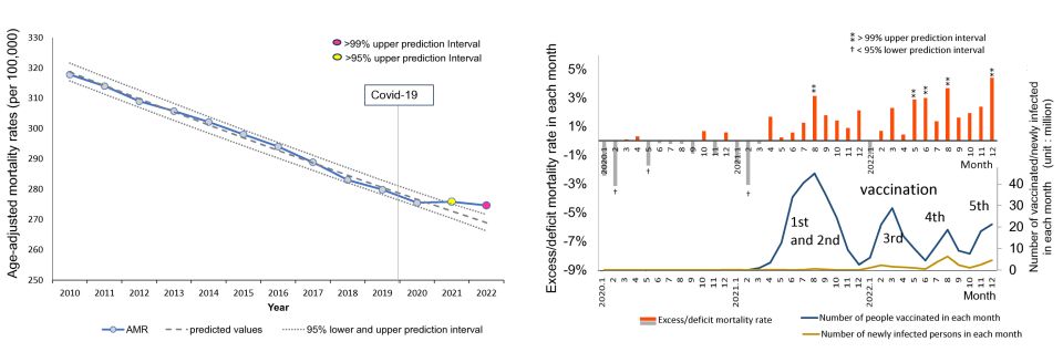 A tanulmány azt mérte fel, hogyan változott az életkorhoz igazított halálozási ráta (AMR) Japánban a Covid (2020-2022) során. Hivatalos statisztikai adatokat használták fel a megfigyelt éves és havi AMR-ek és a Covid előtti (2010-2019) adatokon alapuló előrejelzett arányok összehasonlítására logisztikus regressziószámítás segítségével.